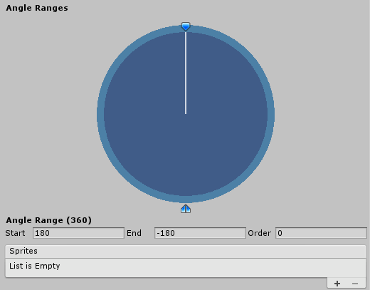 Sprites List of Sprites assigned to the selected Angle Range. Displays a list of all Sprites assigned to the selected Angle Range. The order of Sprites in the list determines their Sprite Variant number, starting from zero at the top of the list. The first Sprite at the top of the list is the Sprite displayed by default at a Control Point.
