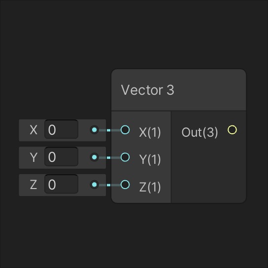 A Vector node with a label for the X component set to 0. There is a connection marked X(1) leading to an output labeled out(1). An arrow extends from the output, indicating the flow of this vector’s X value through the system. a Vector 2 node with two components: X set to 0, connected via X(1) to an output labeled out(2), Y set to 0, connected via Y(1). Arrows indicate the flow of these two values from their respective outputs.