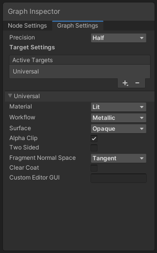 A Target determines the end point compatibility of a shader you generate using Shader Graph. You can select Targets for each Shader Graph asset, and use the Graph Settings Menu to change the Targets.