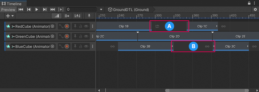 In the gap after the selected Animation clip, the GameObject bound to the Animation track repeats the entire animation forwards, then backwards. Use the Clip In property to offset the start of the loop. Changing the Clip In property affects the start of the loop when looping forward, and the end of the loop when looping backwards.