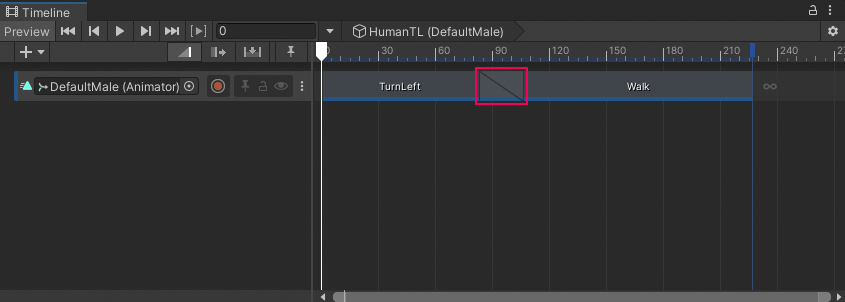 For example, in the transition between the `TurnLeft` clip and the `Walk` clip, the `Walk` clip was repositioned to start at frame 83. The rest of the clip properties are unchanged from their default values.
