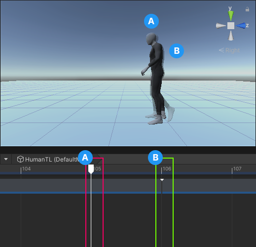 # Animate a humanoid This workflow demonstrates how to use a Timeline instance to animate a humanoid model so that it turns left and begins to walk. Although this workflow uses a humanoid, you can use this animation method for any GameObject. This workflow uses the humanoid model named `DefaultMale` and animation source assets from the [Gameplay Sequence sample](samp-gameplay-demo.md) for its examples. Consult [Timeline Samples](samp-overview.md) for information on the samples available from the Timeline package and how to import these samples into your projects. This workflow starts with a Timeline instance that has an empty Animation track bound to the `DefaultMale` humanoid model. ![](images/tl-human-start.png) _The `DefaultMale` humanoid model linked to a Timeline instance (`HumanTL`) with an empty Animation track bound to the same model_ While animating the humanoid model, this workflow demonstrates how to do the following: 1. [Add and position Animation clips](#addclips). 1. [Match clip offsets](#matchclips). 1. [Create blends between clips](#blendclips). 1. [Manually adjust clip offsets to reduce foot sliding](#reduceslide). ## Add and position Animation clips 1. From your Project, drag an animation source asset into the Animation track to add a new Animation clip. Dragging a source asset adds an Animation clip on the same track. The duration of the Animation clip matches the source asset. 1. To position, resize, or trim the Animation clip in the Content view, select **Mix mode** as the Edit mode. There are [three Edit modes](clip-overview.md) that affect the editing behavior of the Timeline window. When the Timeline window is in **Mix mode**, you can drag to position, trim, and blend clips. You can also select an Animation clip to modify its [Animation clip properties](insp-clip-anim.md), including its Start, End, and Duration, in the Inspector window. ![](images/tl-mix-mode-turnleft-clip.png) _The Mix mode (red) is the selected Edit mode. The `TurnLeft` clip is positioned to start at frame 0._ 1. Add a second Animation clip. This workflow adds a walk clip (`Walk`), positions the clip so it starts immediately after the first clip, and it resizes the second clip to include one loop. ![](images/tl-human-all-clips.png) _Animation track with the `TurnLeft` and `Walk` Animation clips_ 1. Play the Timeline instance. In this example, the `DefaultMale` animation jumps between each Animation clip because its position and rotation at the end of each clip does not match the position and rotation at the start of the next Animation clip. ![](images/spec-human-before-match.png) _The `DefaultMale` jumps between the `TurnLeft` Animation clip, which ends at frame 105 (A), and the `Walk` Animation clip, ghost model which starts at frame 106 (B)_ ## Match clip offsets To fix animation jumping between clips, match the offset of each Animation clip. The Timeline window provides [different methods for matching offsets](clip-match.md). This workflow demonstrates how to match an Animation clip with the previous clip. In this workflow, to match the TurnLeft clip with the previous clip, follow these steps: 1. Select the TurnLeft clip. 1. Right-click the selected clip and choose **Match Offsets to Previous Clip** from the context menu. The position and rotation of the humanoid at the start of the second Animation clip (`Walk`) matches the position and rotation of the humanoid at the end of the first Animation clip. ![](images/spec-human-after-match.png) _The ghosted `DefaultMale` at the start of the `Walk` Animation clip, which starts at frame 106 (B), matches the position and rotation of the `DefaultMale` at the end of the `TurnLeft` Animation clip, which ends at frame 105 (A)_ 1. Play the Timeline instance again. Although the position and rotation of the humanoid matches, there is still a jump between the two Animation clips because the humanoid is in different poses: * At the end of the `TurnLeft` Animation clip, the feet are on the ground and the arms are slightly raised. * At the start of the `Walk` Animation clip, the left leg is off the ground and the arms are in a relaxed position. To remove the jump and to transition between these two poses, you can [create a blend](#blendclips). ## Create blends between clips Create a blend to seamlessly mix between two different animations or poses. The Timeline window includes many different ways to [create a blend](clip-blend.md) between Animation clips. To create a blend, move an Animation clip until it overlaps another Animation clip. You might need to adjust the size of the Animation clips, the Blend Area, the Clip In value, and the shape of each Blend Curve to create a smoother transition between the two poses. For example, in the transition between the `TurnLeft` clip and the `Walk` clip, the `Walk` clip was repositioned to start at frame 83. The rest of the clip properties are unchanged from their default values. ![](images/tl-human-blend.png) _Overlap two clips to create a smooth transition between two Animation clips_ As the `TurnLeft` clip transitions to the `Walk` clip, the blend removes the obvious jump between poses. The transition between most body parts appears natural, however in this case, the blend between the different positions of the foot results in an unnatural slide. ## Reduce foot sliding To reduce foot sliding, manually adjust the offset of an Animation clip so that the position of the foot changes less drastically. To manually adjust the offset, follow these steps: 1. Select the Animation clip in the Timeline window and, in the Inspector window, expand **Animation Playable Asset**. ![](images/insp-clip-anim-playable-walk.png) _The **Animation Playable Asset** properties include the **Clip Transform Offsets**_ In this example, the X Position. Z Position, and Y Rotation of the **Clip Transform Offsets** for the Walk Animation clip is not zero because a **Match Offsets to Previous Clip** was performed earlier in this workflow. Match to a 