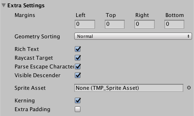 | Extra Padding | Enable this option to add extra padding to character sprites. TextMesh Pro creates sprites to fit the visible text, but the result isn't always perfect. This setting reduces the chances that glyphs are cut off at the boundaries of their sprites. |
