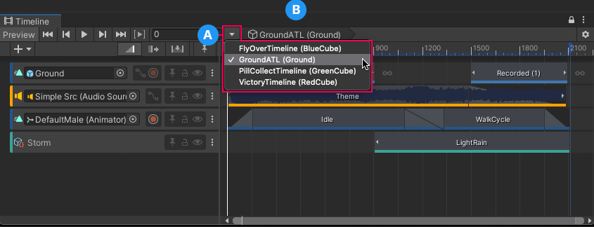 Each menu item and the Timeline title displays the name of the Timeline asset and its associated GameObject in the current Scene. For example, the Timeline asset named GroundATL is associated with the Ground GameObject. In this case, the Timeline title displays GroundATL (Ground).